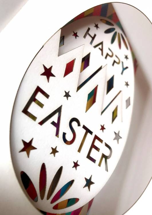 150x100mm (6x4") white card with a cracking Easter Egg cut design showing multi-coloured harlequin pattern printed inside.