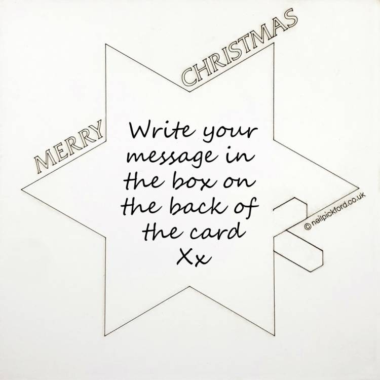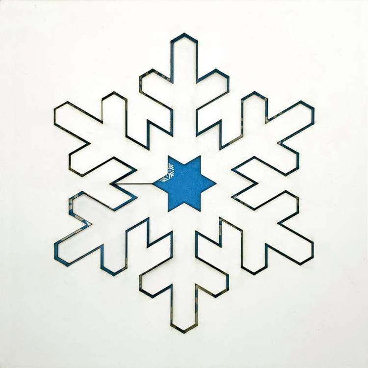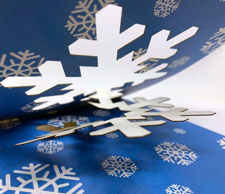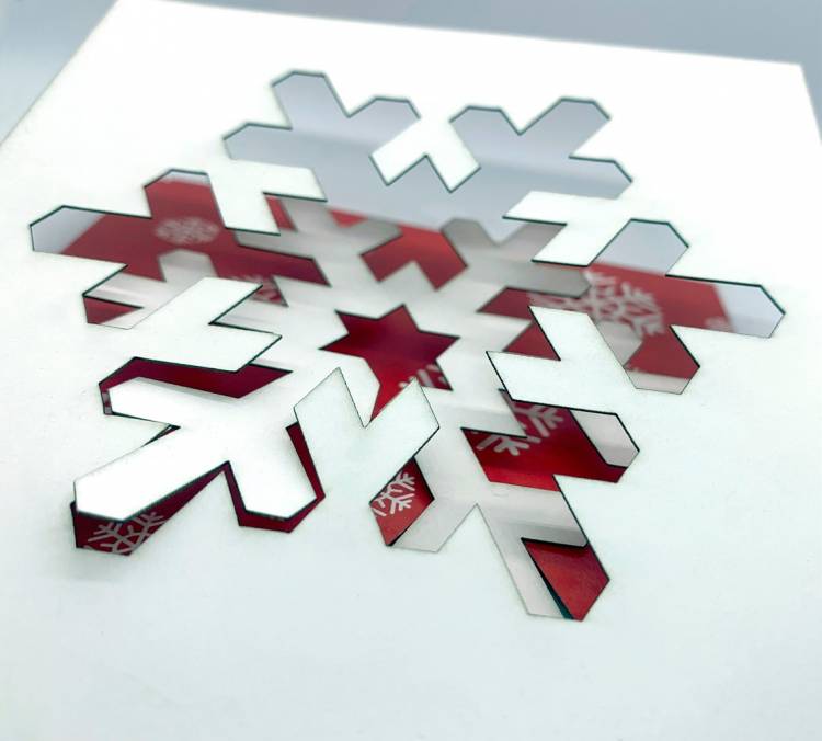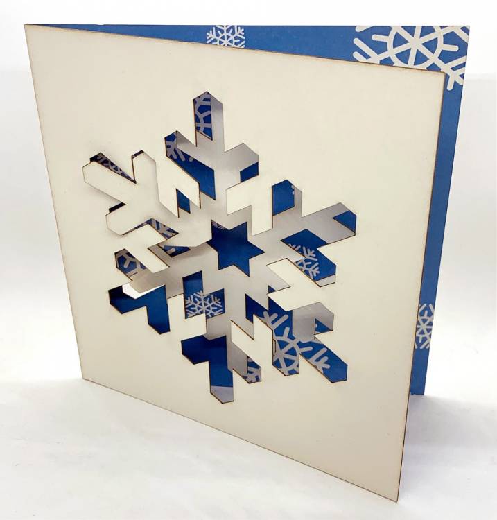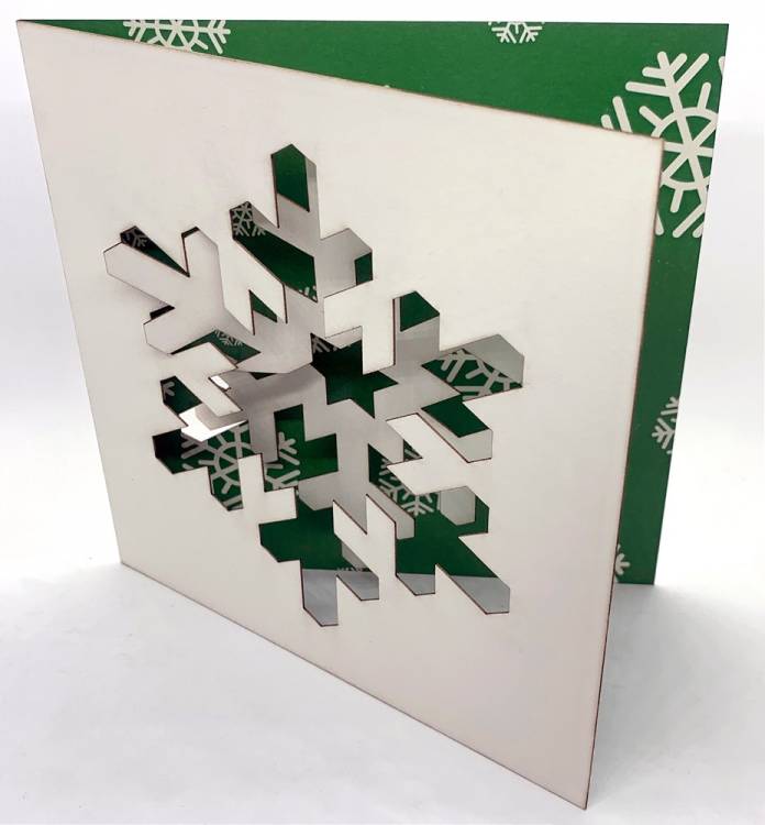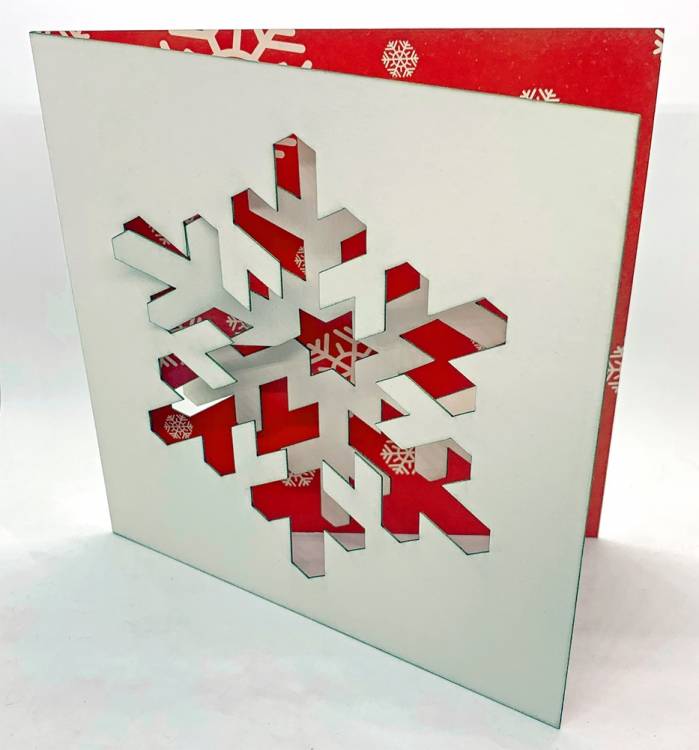 125mm (5") square white card with snowflake cut design showing snowflake pattern printed inside – on blue, green or red.