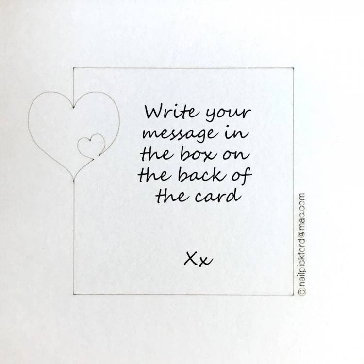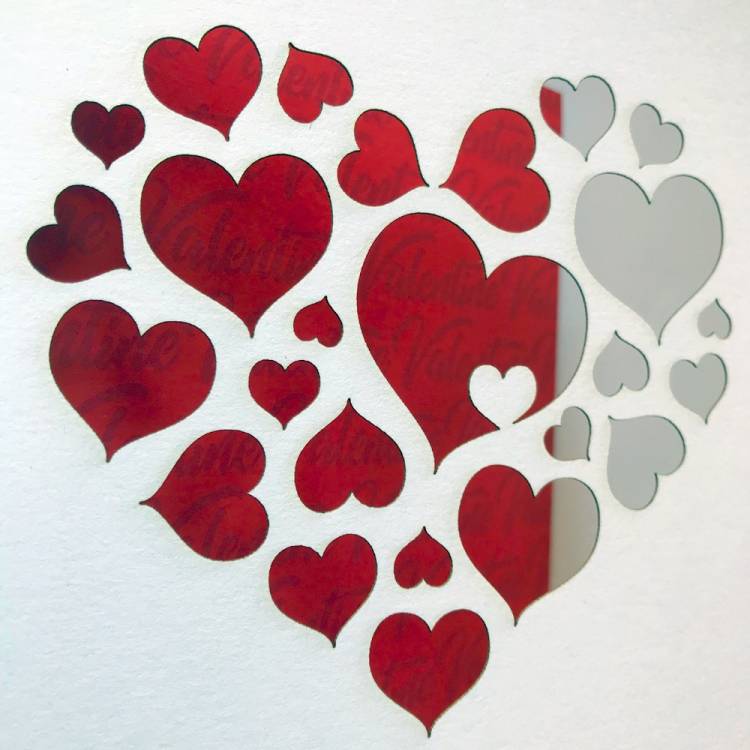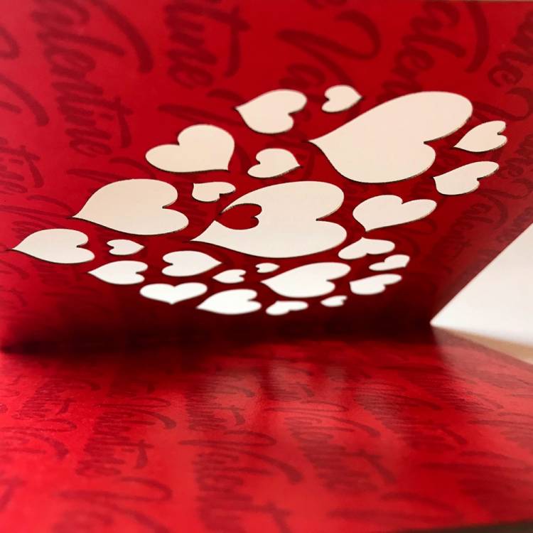 125mm (5") square white card with multi-heart cut design showing red Valentine pattern printed inside